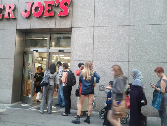 - Sometimes the Union Square Trader Joe’s gets so busy that it reaches capacity, and people must wait outside to enter. Difficult to see in this pic, but a TJ’s employee is playing the role of gatekeeper. Several other employees inside are tasked solely with queue management. I try and avoid shopping there in those crazy times.