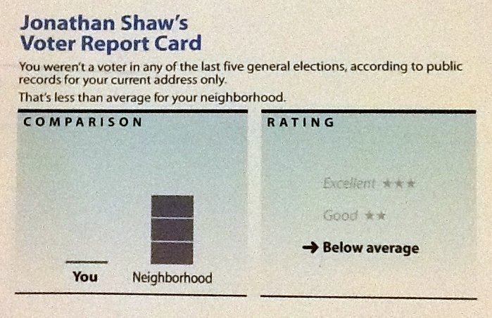 Along with it, I received a “Voter Report Card” from the League of Conservation Voters. Although I definitely *have* voted in all general elections for the past twenty years (just not here in NYC), I still found myself immediately feeling self-conscious, standing there in the post office with this indicting report.