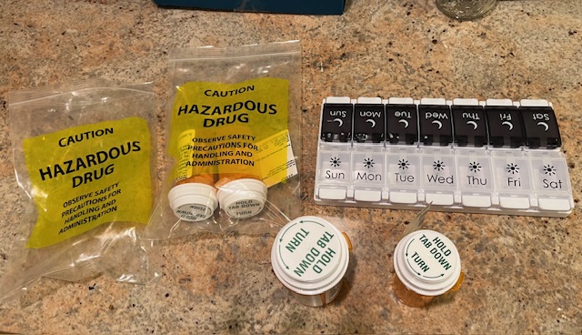 Meanwhile, here’s a little window into my world — this past Sunday evening, I prepared for the week by getting all my chemo pills organized. These are indeed hazardous; when I handle a lot of pills, like on Sunday, I wear disposable gloves. When I actually take the pills, in the mornings and evenings, I wash my hands thoroughly afterwards. It is indeed a strange thought to intentionally consume hazardous material — but the goal is to destroy as much of the cancer as possible, in the process.