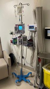 That’s right, you don’t actually need to stay seated during the chemo infusion process. If you look up at the photo of me, you‘ll notice two electric cords plugged into the outlet. Those are connected to this bad boy. This, my friends, is a portable drip stand. I stepped back from it to take this photo. The oxaliplatin (still over an hour to go) is in one of the bags hanging from hooks at the top.