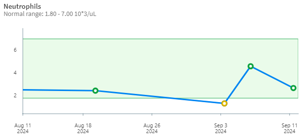 Meanwhile, my neutrophils are back up in acceptable range … after mysteriously spiking just 3 days after they were so low. And the diarrhea stopped as of last night. Fingers crossed, I’m good to go for the next infusion, now scheduled for Sept 19.