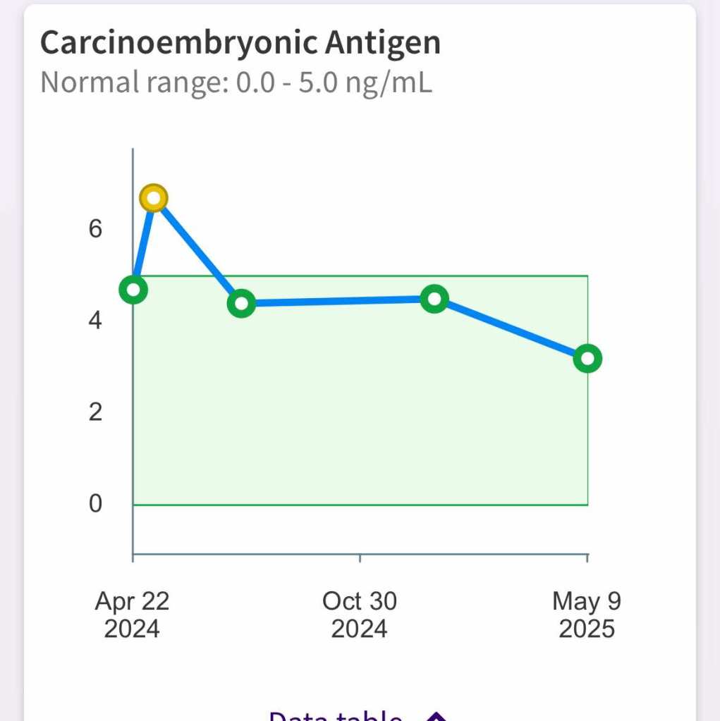 My CEA was also checked on Friday; that has also come down, which is a good thing. My latest CEA count is 3.2, down from 6.7 last May (checked right before I started radiation).