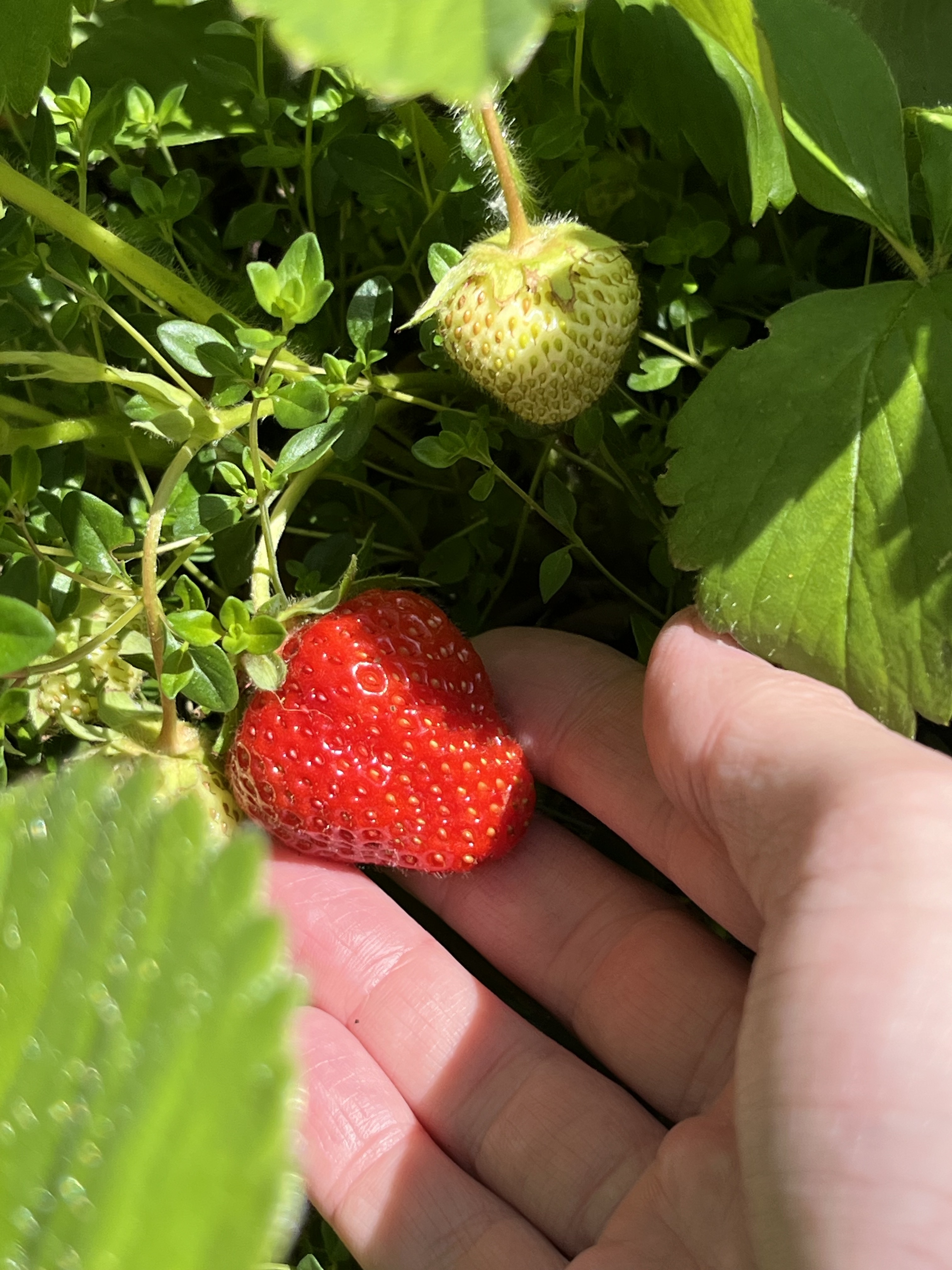 We’re just starting to see some ripe strawberries. My 10-yr-old ate the first ripe one we spotted; pictured is the second: